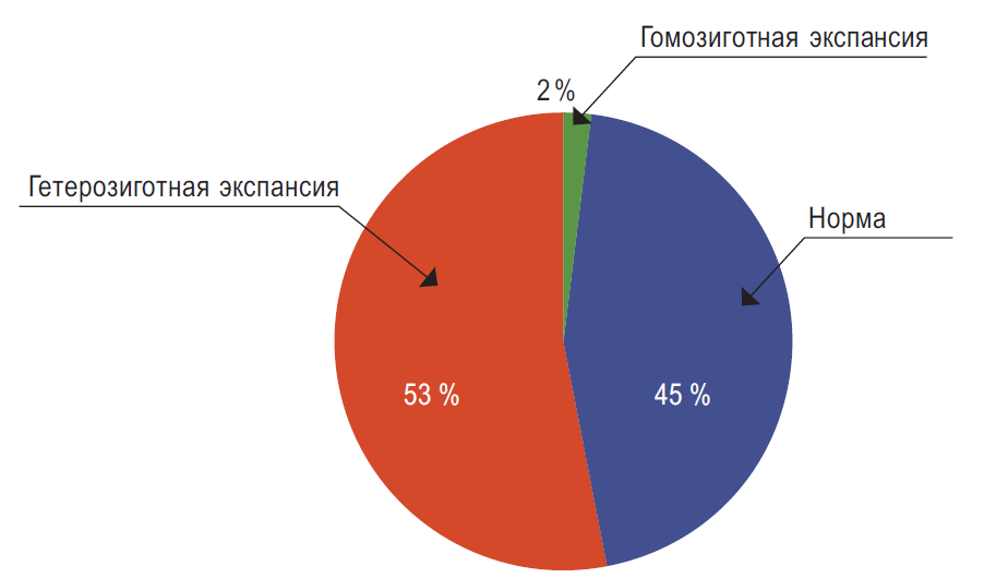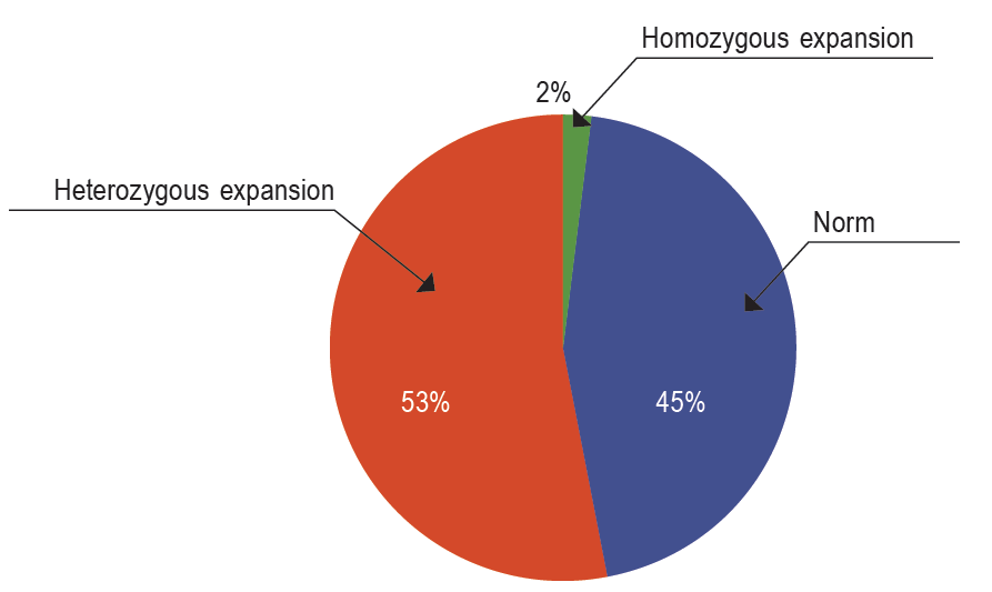 Fig. 4. Распространённость экспансии CTG-повторов в гене TCF4 в группе пациентов с эндотелиальной дистрофией роговицы Фукса