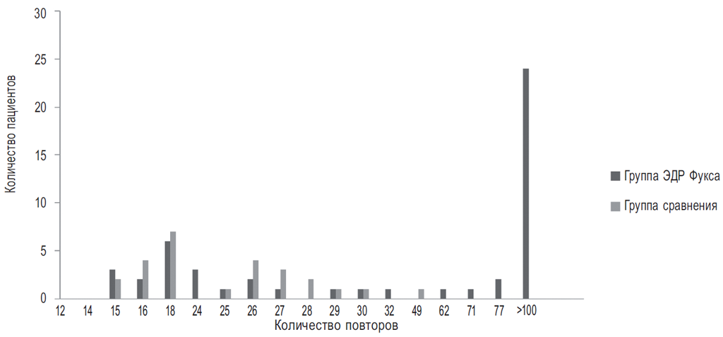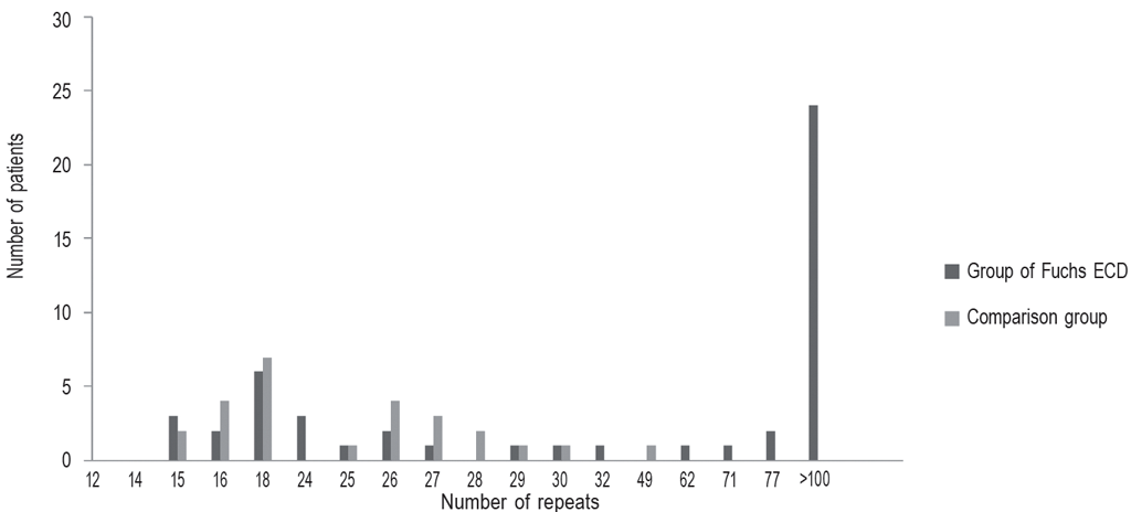 Fig. 5. Количество CTG-повторов в группе пациентов с эндотелиальной дистрофией роговицы Фукса и в группе сравнения