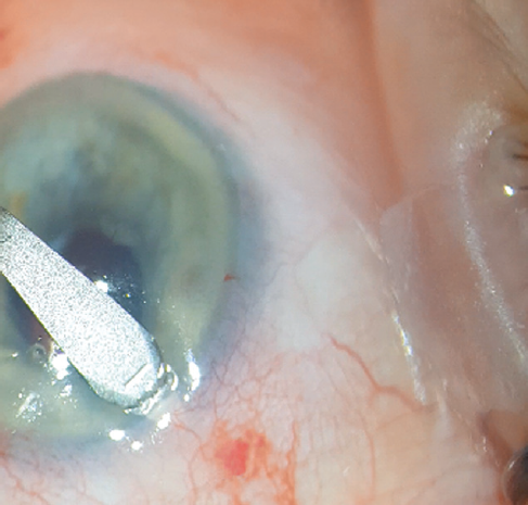 В прозрачной части лимба на 3 и 9 ч или в других противоположных меридианах кератомом может быть выполнена предварительная насечка на 0,5 глубины лимба шириной около 2 мм. Кератомом выполняют вкол на уровне средних слоёв лимба в направлении склеры, при этом он погружается в непрозрачную часть лимба примерно на 1,5 мм (данные движения аналогичны формированию роговичного тоннеля, но выполняются не в сторону роговицы, а в сторону склеры и на меньшую глубину) (см. рис. 1). Таким образом формируется треугольный формы карман на уровне средних слоёв лимба.