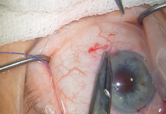 Рис. 4. Интрасклеральное проведение нити с выведением из лимбального мини-кармана