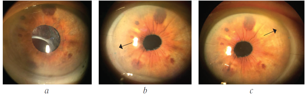 Рис. 6. Фото переднего отрезка глазного яблока до операции (а), через 1 месяц (b) и через 3 месяца (c) после операции: зоны лимбальных мини-карманов с погружёнными узлами не визуализируются уже через месяц после операции