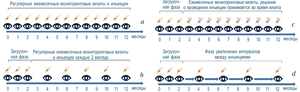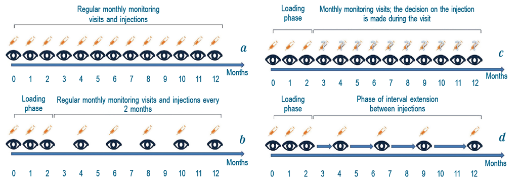 Fig. 1. Regimens of anti-VEGF therapy: а – the fixed regimen includes monthly monitoring visits, on each of which patient is being injected; b – fixed mode with a frequency of injections of 1 every 2 months. After 3 monthly loading injections, the interval between visits, on which the injection is made increases to 2 months; c – PRN (Pro re Nata) involves the injection of necessity. After the end of the loading phase, the frequency of monitoring visits continues on a monthly basis, with decision making about inject or not on each of them; d – Treat & Extend therapy regimen (T & E) is based on an individual approach to disease activity. After the loading phase, the intervals between exams, each of which is accompanies with injection, increase for a certain period, for example 2 weeks. After determining the maximum possible interval between injections, the patient continues therapy in this mode. If the patient shows a return of the disease activity, the intervals between injections should be shorten accordingly. The image reflects the treatment regimen scheme with the stepwise interval extension