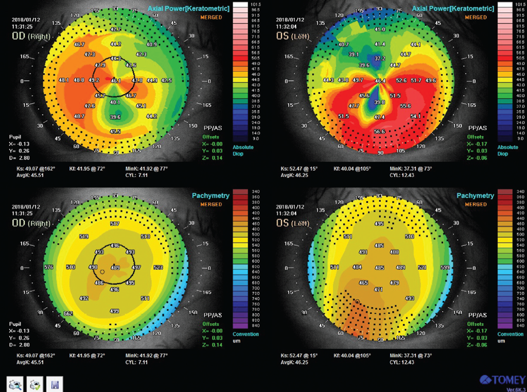 При биомикроскопии обнаружено патологическое изменение формы роговицы обоих глаз — роговица не сферичная, в нижней её части срез истончён, имеет вид серповидной полосы шириной 1 мм, роговица выступает над линией истончения. Была проведена кератотопография, которая показала паттерн в виде «целующихся птичек» или «клешни краба» (рис. 1).