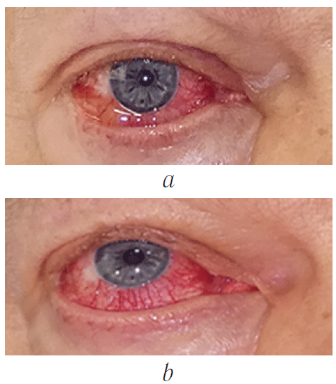Рис. 2. Динамика хемоза правого глаза в зависимости от времени суток: a — хемоз в первой половине дня; b — отсутствие хемоза вечером