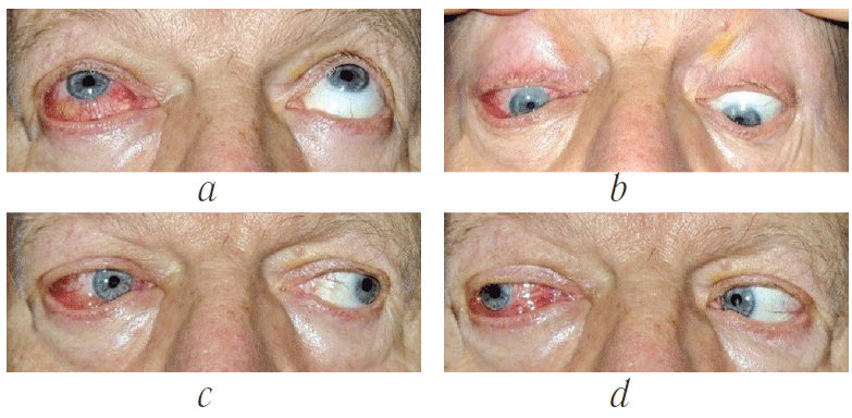 Правый глаз. В правой надбровной области определяются расширение и извитость подкожных вен. Отёк основания верхнего века, а также его опущение на 2 мм. Глазная щель сужена. Положение глазных яблок при взгляде прямо ортофорично (рис. 1). Наблюдаются застойная инъекция глазного яблока, хемоз, усиливающийся по утрам (рис. 2). Острота зрения — 1,5. Экзофтальмометрия: правый глаз — 28 мм, левый — 21 мм, при базовом расстоянии — 110 мм, экзофтальм — 7 мм. Гиперфтальм — 2 мм. При пальпации глазное яблоко безболезненно. Репозиция глазного яблока невозможна. Отмечается ограничение подвижности глазного яблока вверх на 10°, по горизонтали (кнаружи и кнутри), а также вниз на 15° (рис. 3).