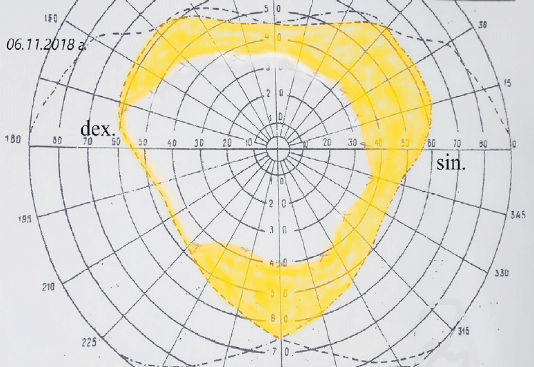 Fig. 4. Binocular visual field of the patient G. upon admission to the clinic (the double vision area is shown in yellow)