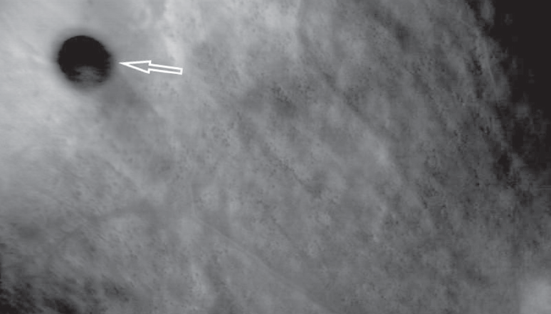 Рис. 5. Сканирующая лазерная офтальмоскопия (ретрорежим), верхневнутренний квадрант периферической сетчатки левого глаза. «Крышечка» дырчатого разрыва сетчатки в стекловидном теле (стрелка)