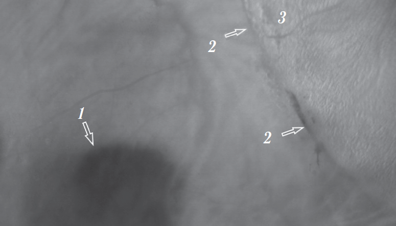 Fig. 6. Scanning laser ophthalmoscopy, retro mode. Upper temporal quadrant of the peripheral retina of the left eye: 1 – pigmented nevus; 2 – demarcation line; 3 – retinal detachment