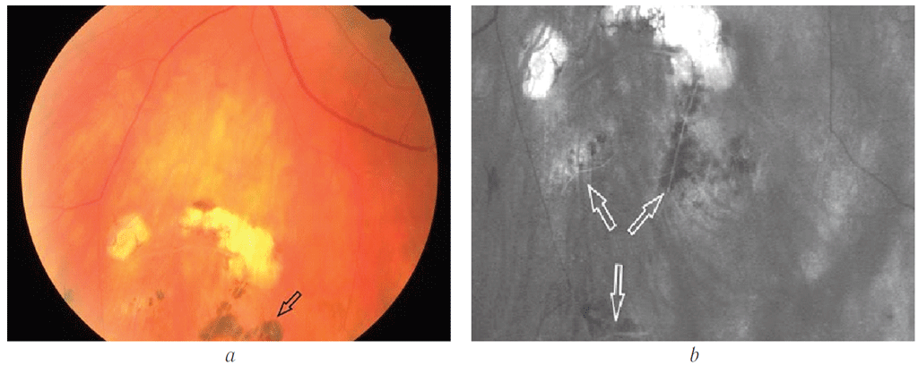 Рис. 7. Фото глазного дна (а) и сканирующая лазерная офтальмоскопия, ретрорежим (b). Нижние квадранты периферической сетчатки левого глаза: Витреохориоретинальная дистрофия по типу «решётчатая» (стрелки)