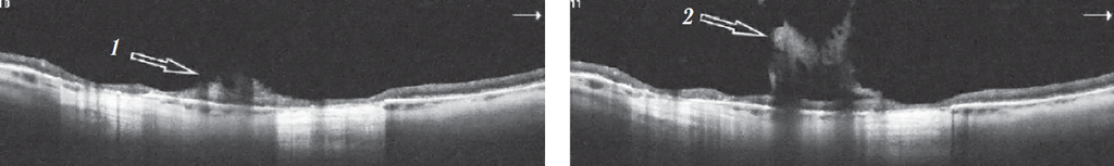 Рис. 8. Оптическая когерентная томограмма периферической сетчатки левого глаза. Срез через очаг хориоретинальной дистрофии: 1 — место тракции сетчатки тяжем фиксированного и уплотнённого стекловидного тела (2)