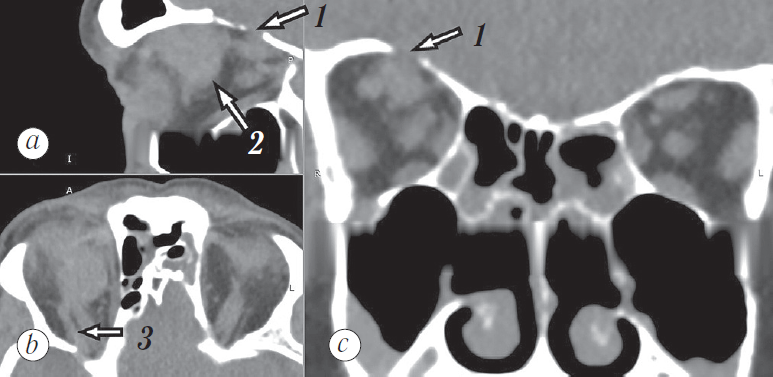 Fig. 10. Computed tomogram of the orbits in the sagittal (a), axial (b) and coronal (с) projections. 1 – suggested location of the upper orbital wall defect, 2 – orbital neoplasm, 3 – band to the orbital neoplasm (arrow)