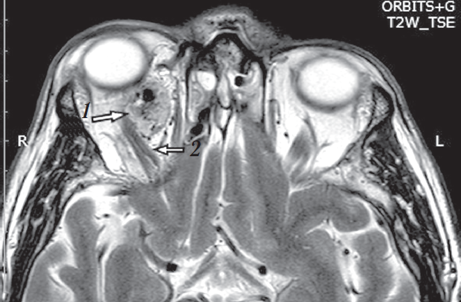 Fig. 11. Magnetic resonance imaging T2 WI, axial projection. Tumor in the right orbit (1), dilated upper ophthalmic vein (2)