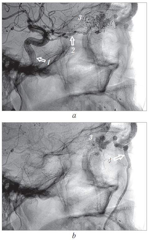 Fig. 12. Angiogram of the right internal carotid artery and the vessels of the right orbit, sagittal projection: a — arterial phase, b — venous phase: 1 – right internal carotid artery. The vessels of the neoplasm (а and b, 3) are fed from the dilated ophthalmic artery (а, 2) with drainage into the right facial vein (b, 4)