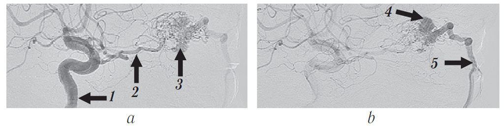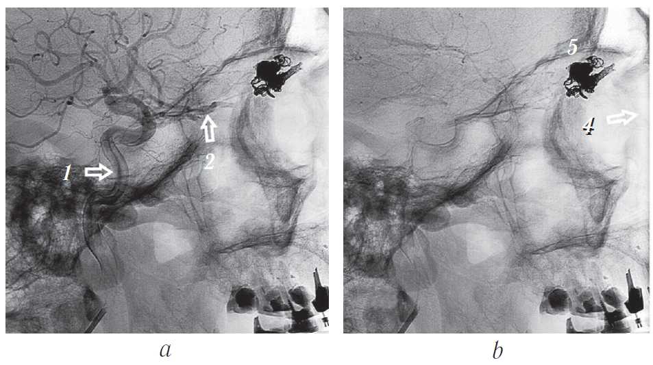 Fig. 16. Control angiography of the right internal carotid artery and vessels of the right orbit, sagittal projection: arterial phase (a) and venous phase (b). At the arterial phase (a), the ophthalmic artery is contrasted (2), the vascular network of the neoplasm is not detected. In the cavity of the tumor in both stages of angiography (a and b), radio opaque embolizing microspirals (5) are visualized. At the venous phase (b), there is no outflow from the tumor into the right facial vein (4)