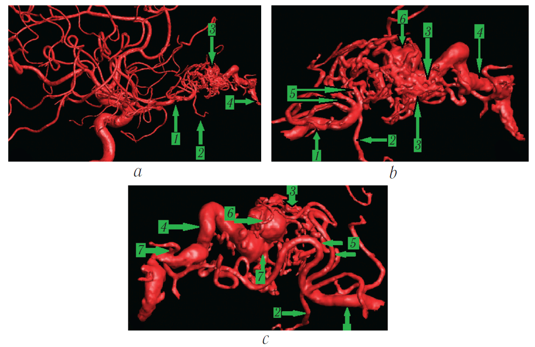 Fig. 14. Rotational angiogram: a – general appearance in lateral view; b – left-side appearance of vascular network of the tumor; c – right-side appearance of vascular network of the tumor. 1 – ophthalmic artery, 2 – central retinal artery, 3 – proper vascular network of the neoplasm, 4 – draining vein, 5 – vascular network afferents, 6 – varicose dilated drainage vein opening, 7 – arteriovenous fistulas (shunts)