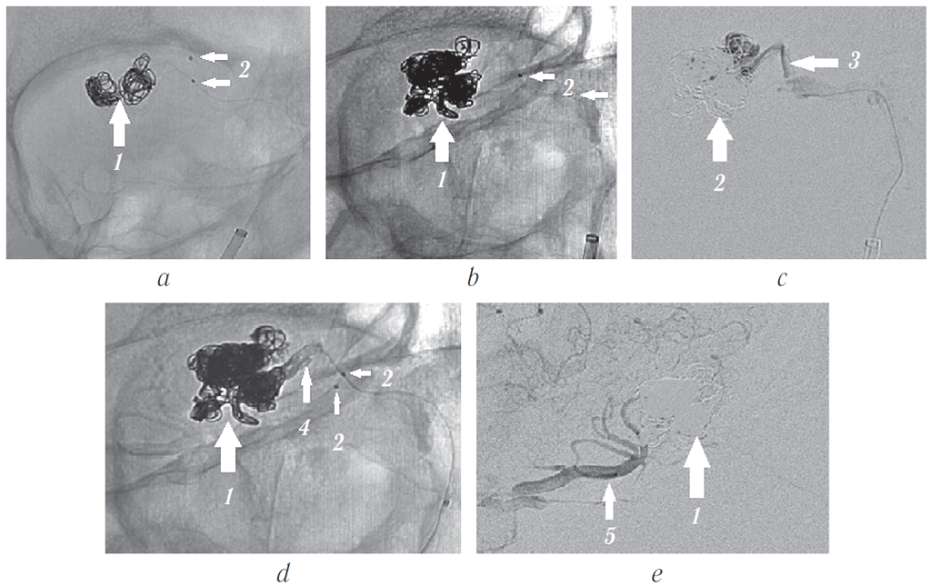 Fig. 15. Dynamics of tumor vascular network embolization by detachable microspirals, and the results of angiography: a and b – dynamics of embolization of the vascular network of the tumor; c – phased angiography through a transvenous microcatheter; d – final result after the injection of the liquid non-adhesive composition ONYX18; e – control angiography, the final result – proper vascular network is not contrasted, the draining vein is not filled. 1 – Target coils, 2 – microcatheter tags, 3 – slowed blood flow through the draining vein, 4 – liquid non-adhesive composition ONYX18 in the draining vein, 5 – ophthalmic artery