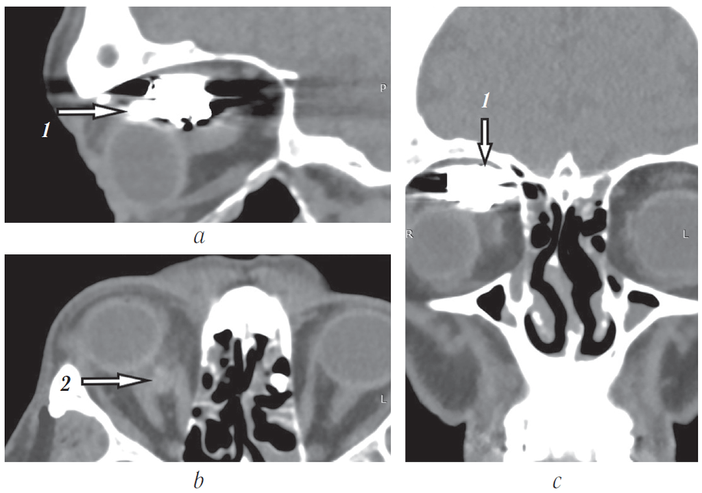 Рис. 18. Компьютерная томография после эмболизации собственной сосудистой сети новообразования правой глазницы. На сагиттальной (a) и корональной (c) проекциях визуализируются артефакты в полости эмболизированного новообразования (1). На аксиальной проекции (b) определяется часть интактного (неэмболизированного) новообразования (2)