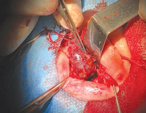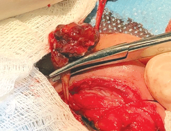 После предоперационной подготовки, которая заключалась в консультации нейрохирурга, ангиографии сосудов правой глазницы с последующей эмболизацией сосудов новообразования, выполнена операция удаления опухоли. Ввиду ожидаемой интенсивности кровотечения в ходе операции определена группа крови пациента, подготовлены одногруппная кровь и кровозамещающие жидкости, гемостатические средства. Операцию проводили под общим эндотрахеальным обезболиванием. Произведена двукратная обработка операционного поля раствором повидон-иода 10 %. Веки раздвинуты блефаростатом. Наложены «держалки» на верхнюю и медиальную прямые мышцы глазного яблока. При этом отмечались выраженный отёк, утолщение и повышение плотности конъюнктивы и субконъюнктивы, что затрудняло выделение мышц. Произведён линейный разрез кожи длиной около 3,5 см по верхнему краю глазницы. Тупо раздвинуты и частично рассечены подкожная клетчатка, волокна круговой мышцы глаза и тарзоорбитальная фасция. Рассечение надкостницы и её отслойку от кости не выполняли. Осуществлён вход в полость глазницы. С помощью распатора, ножниц и шпателей жировая клетчатка глазницы отделена от надкостницы верхней стенки глазницы на глубину около 3,0 см. На этой глубине в верхнемедиальном квадранте глазницы между верхней и медиальной мышцами в соответствии с локализацией опухоли путём раздвигания жировой клетчатки с помощью ножниц выполнен вход в полость мышечной воронки. В мышечной воронке за глазным яблоком обнаружено плотное малоподвижное образование вишнёвого цвета, характерного для кавернозной гемангиомы. Однако фиксация этого образования в отличие от подвижной и, как правило, легко удаляемой гемангиомы была необычно жёсткой. Опухоль фиксирована плотными сращениями с окружающими тканями по всей поверхности (рис. 19). Выделить и отделить её от стенок глазницы удалось только с помощью ножниц. В итоге опухоль была мобилизована и удалена. В момент выведения опухоли обнаружен круглый тяж диаметром около 2 мм кремового цвета, фиксированный к опухоли (рис. 20). Предположительно это мог быть запустевший после эмболизации новообразования сосуд. Наличие тяжа, фиксированного к опухоли, мы наблюдали и на компьютерной томограмме (см. рис. 10, 3). Ожидаемой повышенной кровоточивости в ходе операции не наблюдалось. Интенсивность кровотечения была обычной, как при большинстве операций на глазнице, и особых затруднений в ходе операции не создавала.