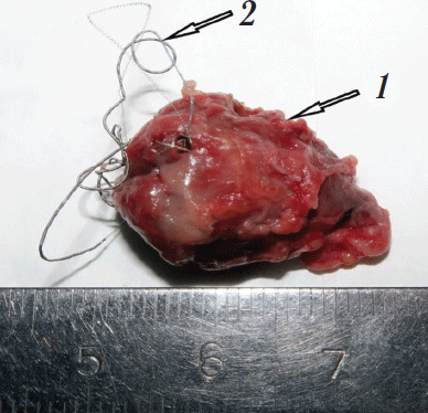 Fig. 21. Removed tumor of the right orbit (1) with elements of embolizing microspirals partially extracted from it (2)