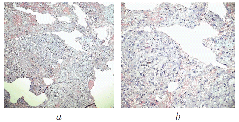 Рис. 22. Гистологический препарат удалённого из правой глазницы новообразования. Окраска гематоксилином и эозином, увеличение ×100 (a), ×200 (b)