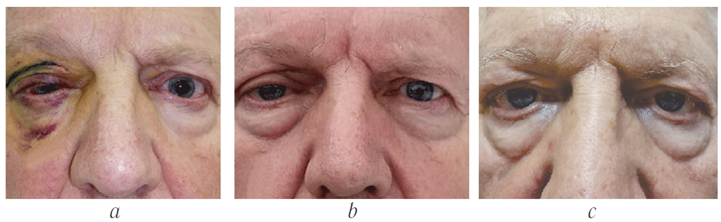 Fig. 23. Patient G., 67 years old. The appearance of the patient after surgery, on the 5th day (a), after 6 weeks (b), after 1 year (c)