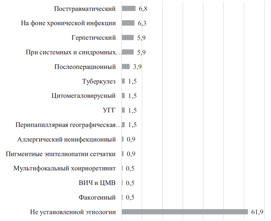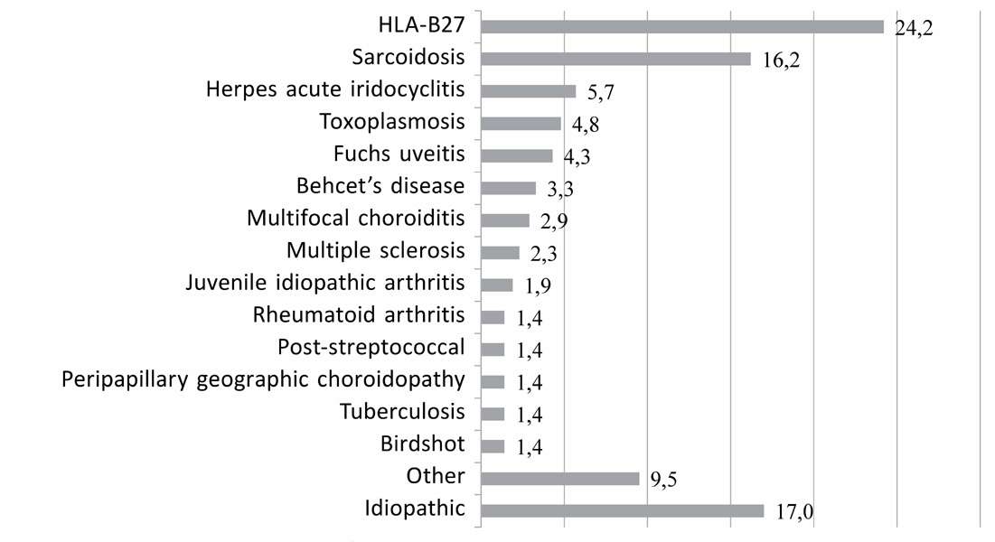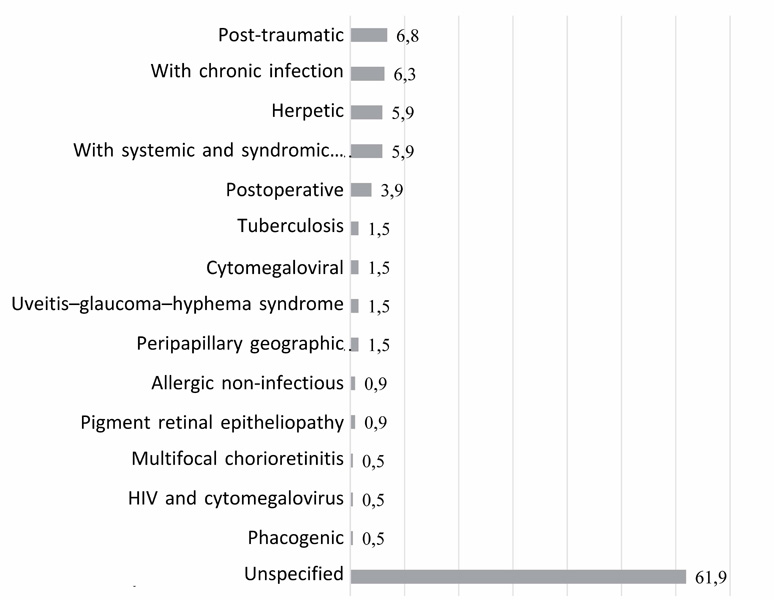 Methods. The first part was to collect the retrospective data on uveitis etiology (2008–2012). The second one consisted of examining all new patients seen in our uveitis center at the Department of Ophthalmology of the Academician I.P. Pavlov First State Medical University (2014–2016) with up to date methods, like laser photometry, dual angiography and other laboratory and instrumental investigational tests.