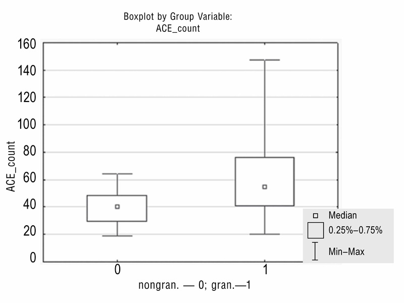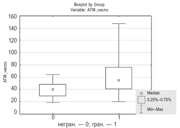 Среднее и срединное значение АПФ при негранулематозном (0) и гранулематозном (1) увеитах (n = 87)