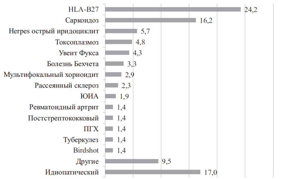 European data on uveitis epidemiology also vary, but to a lesser extent. In 1994, V.T. Tran et al. published the results of a retrospective analysis of case histories of 558 patients (740 eyes), conducted in a uveitis clinic at the Jules Gonin Hospital (Lausanne, Switzerland). In 69% of patients, the cause of uveitis was identified. The most common diseases were HLA-B27-associated acute anterior uveitis (15.9%), uveitis associated with herpes zoster ophthalmicus (9.7%), toxoplasmosis (9.5%), sarcoidosis (5.9%), and pars planitis (5.6%), Fuchs uveitis (5.4%), anterior uveitis caused by herpes viruses (4.1%), and acute retinal necrosis (2.3%) [4]. According to N.P. Jones (Manchester, UK, 2015), who examined 3,000 new patients, Fuchs uveitis (11.5%), sarcoidosis (9.7%), pars planitis (7.9%), idiopathic acute anterior uveitis (7.0%), and toxoplasmosis (6.9%) predominated [10].