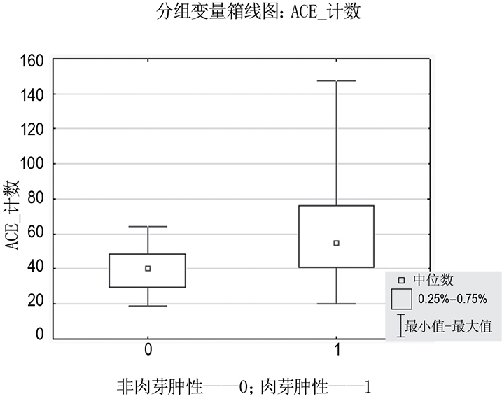 Fig. 2. The difference of ACE amount in blood between granulomatous (1) and nongranulomatous (0) uveitis