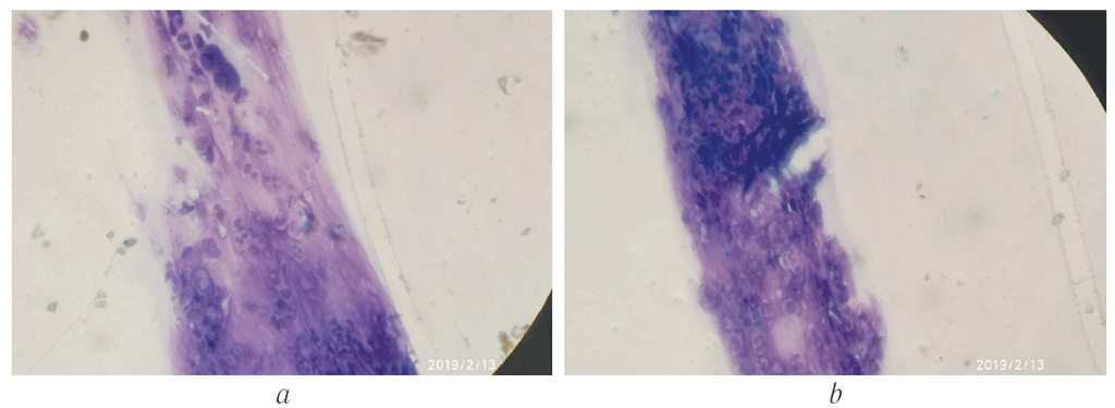 Рис. 1. Цитологический соскоб с раневого края оперированной зоны на 5–7-е послеоперационные сутки: а — основная группа, b — контрольная группа