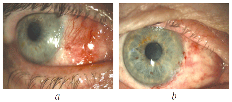 Therefore, the main method of pterygium treatment remains its surgical removal, and much attention has been drawn to this issue [15–17]. To date, more than 100 different methods of surgical treatment have been proposed for pterygium, including simple excision with suturing, which has been replaced by more effective surgical technologies such as barrier auto- and alloplasty in the limbal area using conjunctival grafts, mucous membranes from the lips, dura mater, renal capsule, and other materials [18–20]. However, cosmetic defects registered by authors after surgery in the form of conjunctival tension, deformation and displacement of the semilunar fold and lacrimal caruncle, restriction of eyeball motility, and a high rate of the disease relapses (40%–70%) [16, 17, 19, 21], demonstrate the need for searching new surgical approaches and the selection of optimal biological materials for barrier plastic surgery when removing the pterygium.