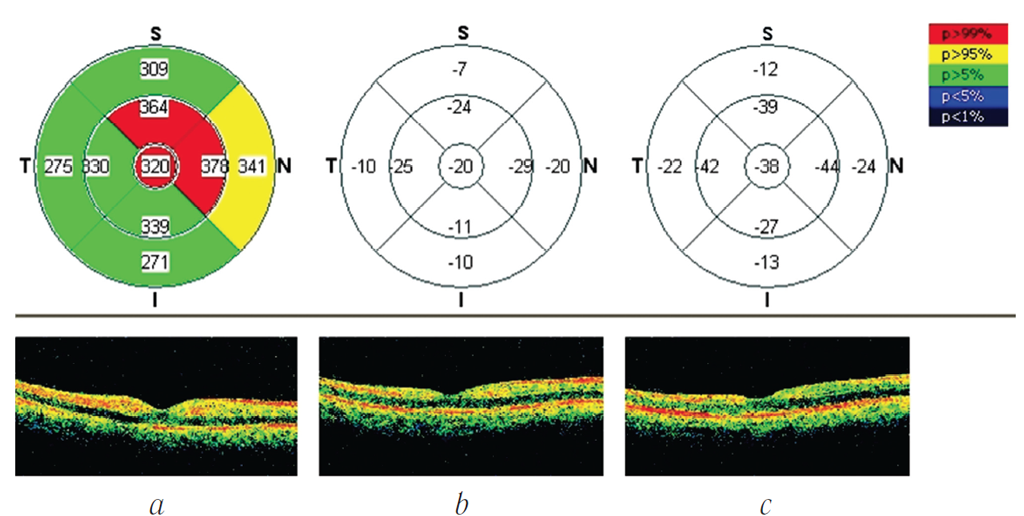 Fig. 2. Optical coherent tomography of the right eye in dynamics: a – on admission to the hospital: an increase of the retinal thickness and decrease in its transparency, a violation of the differentiation of layers; b, c – 2 weeks and a month after treatment: showing a decrease in the thickness of the retinal macula and an improvement in the differentiation and transparency of the inner layers of the retina