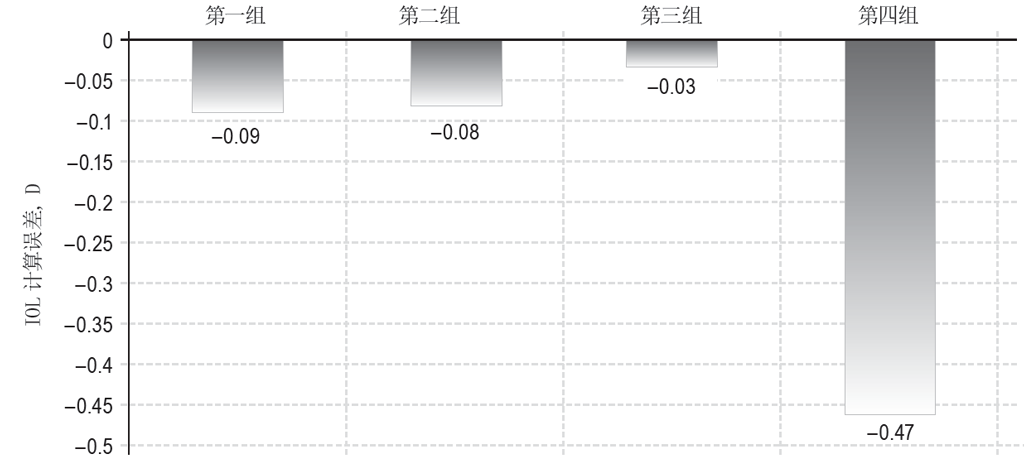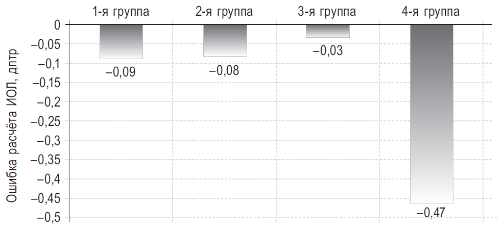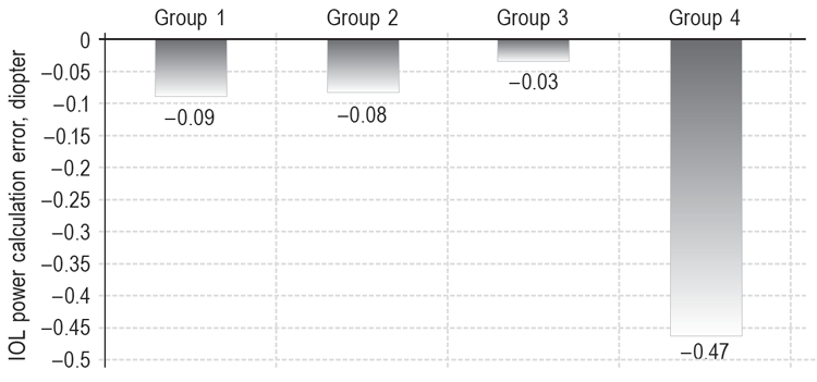 Results. There was no significant difference between study groups 1–3 in IOL power calculation accuracy (the calculation error was –0.09 ± 0.39 D, –0.08 ± 0.45 D, –0.03 ± 0.49 D, for each group respectively). However, we found a higher myopic shift (–0.47 ± 0.48 D, p = 0.095) in the 4th group.