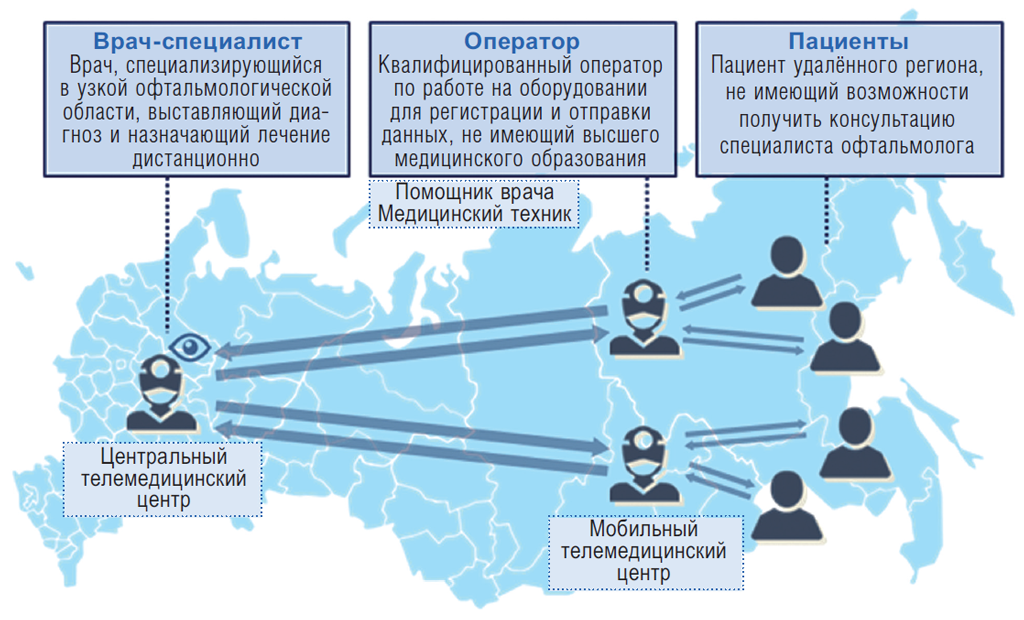 Second-level ophthalmologists cannot deal with all eye diseases independently. There are many subspecialties, such as glaucomatologists, retinologists, ophthalmic surgeons of different fields, and pediatric ophthalmologists. These third-level specialists usually work in specialized ophthalmological centers, both separately and as part of large multidisciplinary clinics. Patients are referred to a third-level doctor by an ophthalmologist, and the number of such subspecialists is much lower. Introducing TO at this stage is even more useful because it enables photoregistration in more detail, and teleconsultations among doctors of the same specialty are more effective. Thus, for example, if a second-level ophthalmologist has the technical ability to perform laser photocoagulation in disputable cases, it becomes unnecessary to refer the patient to the laser center, and it is possible to perform treatment in situ, as prescribed by a specialist in this field. Because the number of ophthalmologists of various subspecialties is lower, the principle of “sorting” patients by second-level doctors is effective ergonomically.
