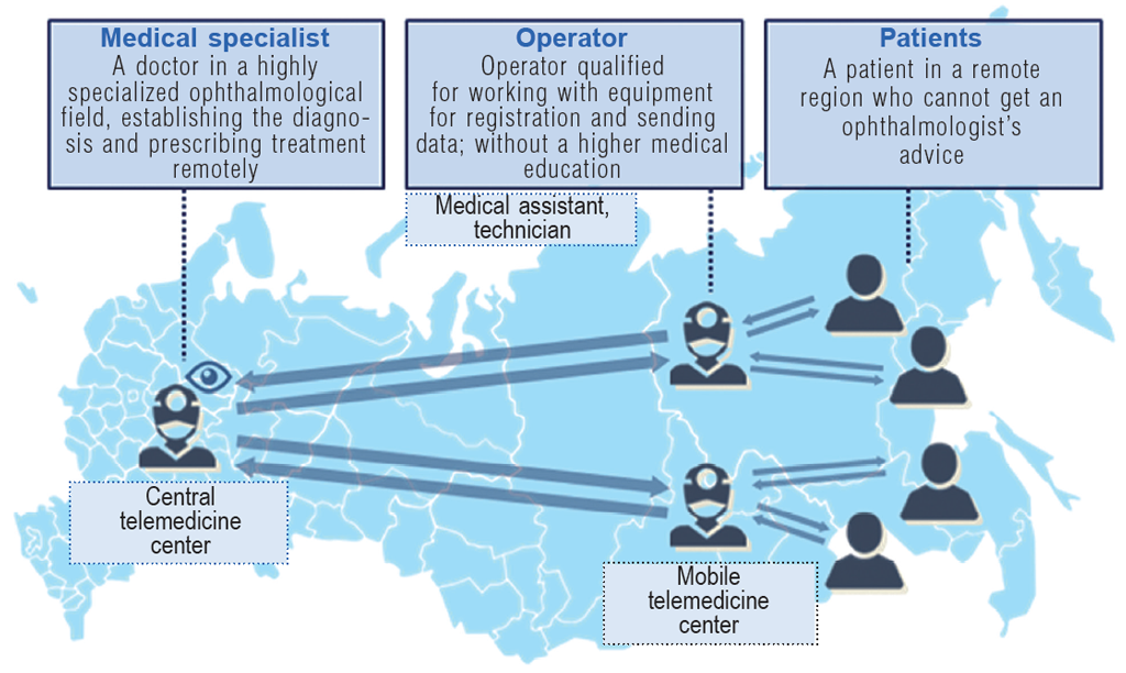 Ophthalmologists conventionally represent the second level in the healthcare model. It may be an ophthalmologist at the same clinic as the first-level doctor, or it may be a doctor from a completely different institution. It is challenging to get an ophthalmologist’s consultation in remote regions because of geographic and other obstacles. Even at this stage, introducing TM can significantly change the approach to providing medical care. The primary care physician can photoregister the patient’s condition easily with a smartphone, and it is also quite feasible in current conditions to send the photograph to an ophthalmologist. An ophthalmologist can assess the patient’s condition remotely in complex and controversial cases, separating patients who require a full-fledged ophthalmological examination and those who can receive care from a primary level doctor. Thus, TO enables two-way communication between specialists of different levels.