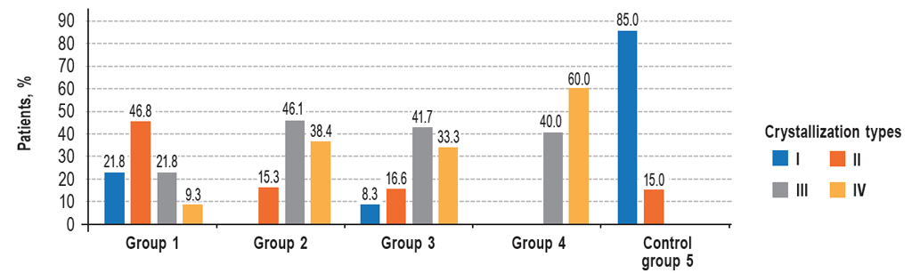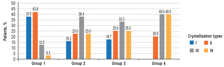 Figure 4 shows the results of crystallography in patients after surgery, obtained after 3 months of follow-up. The graph illustrates that there was a decrease in cases with pathological crystallization of types III and IV and an increase in the number of patients with crystallization of types I and II in all studied groups.