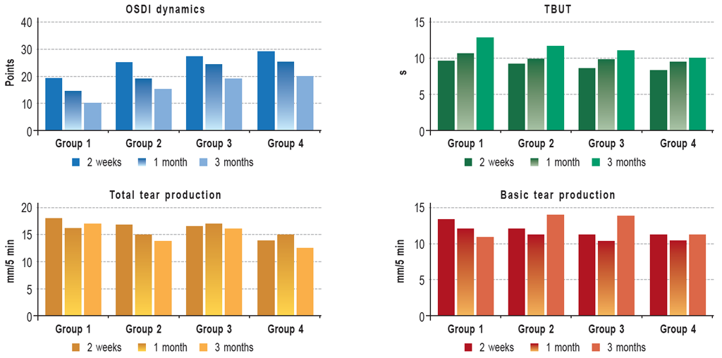 An analysis of DES indicators demonstrated that the inclusion of a lacrymal fluid substitute into the pathogenic therapy in the postoperative period has enabled a decrease in the intensity of DES subjective manifestations and an increase in TBUT after 2 weeks. Indicators of tear production during the follow-up period did not undergo significant changes (Fig. 3).