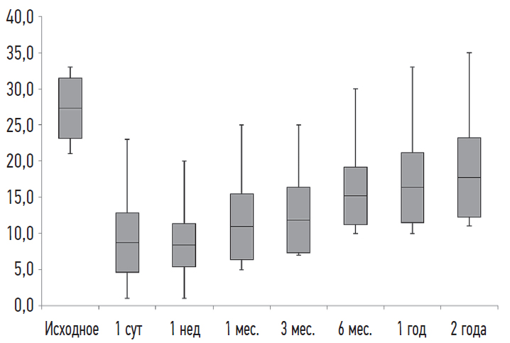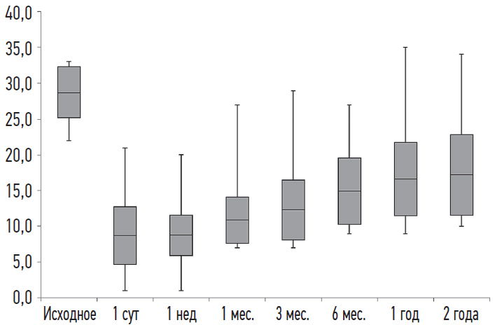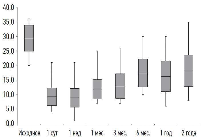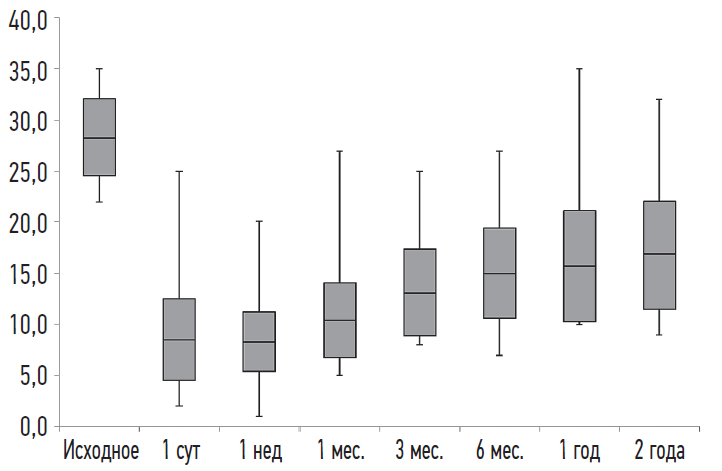 Fig. 4. Dynamics of the intraocular pressure level at all follow-up periods in the group of patients after sinustrabeculectomy modification with the formation of grooves for the intramuscular fluid outflow (subgroup 1a). The x-axis — endpoints of the study, the y-axis — intraocular pressure level