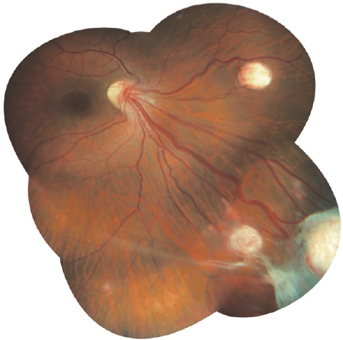 OD — стекловидное тело прозрачное. В макуле без патологии. Диск зрительного нерва (ДЗН) с косым выходом. От ДЗН резко и неравномерно расширенная нижненосовая ветвь направляется к ангиоматозным узлам разного калибра в нижненосовом квадранте (рис. 1). Наиболее крупный периферический узел покрыт фиброзной капсулой с витреоретинальным натяжением (рис. 2);