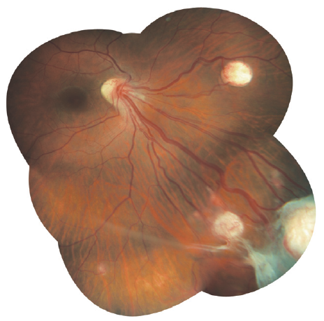 The von Hippel–Lindau disease, multiple retinal hemangiomas in both eyes, mild complex myopic astigmatism were diagnosed. In the LE, acute symptomatic detachment of the posterior hyaloid membrane, multiple peripheral retinal tears, vitreous hemorrhage, congenital hypertrophy of the retinal pigment epithelium were detected. The concomitant diagnosis was Hodgkin’s disease in remission.