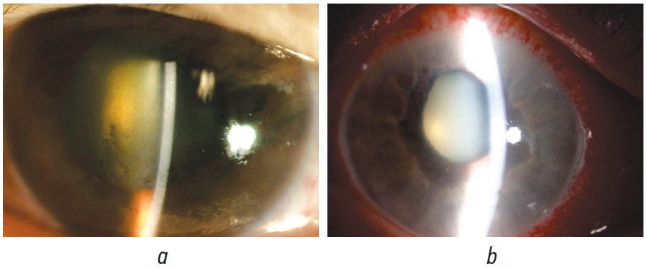 Fig. 1. Clinical cases of acute angle-closure glaucoma: a — a 69-year-old female patient J.; b — a 63-year-old female patient B. On admission: congestive redness of the eyeball vessels, corneal edema, shallow anterior chamber, dilated pupil of irregular shape