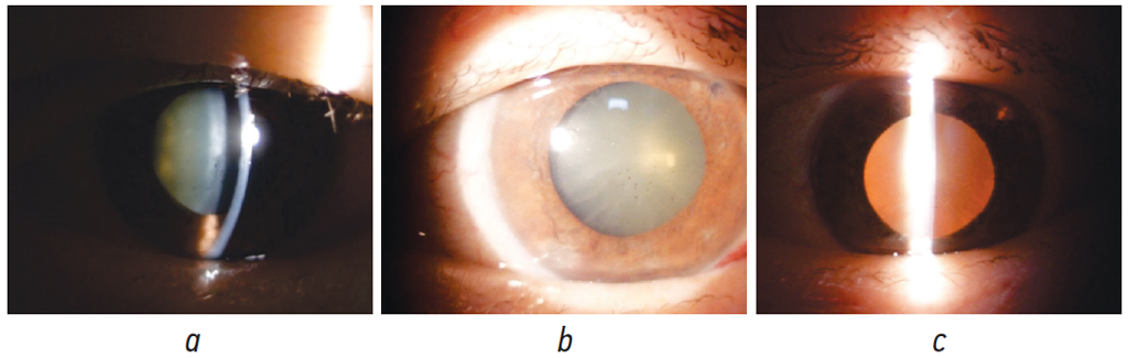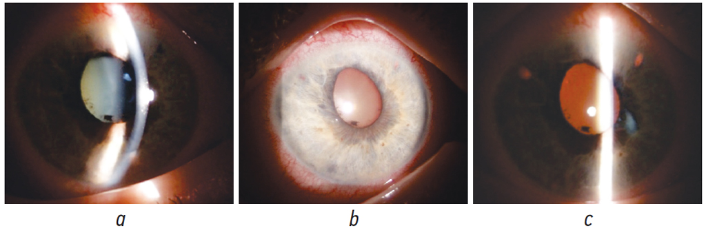 Fig. 3. A 63-year-old female patient B. The first day after micropulse cyclophotocoagulation: a — the cornea is transparent, increase in anterior chamber depth, partially ruptured posterior synechiae in the pupil area; b — redness of the eyeball decreased; c — consistent peripheral colobomas of the iris at 10, 1, 7 o’clock positions