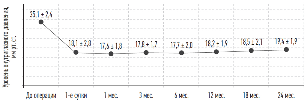 Рис. 4. Динамика уровня внутриглазного давления после проведения циклофотокоагуляции в микроимпульсном режиме в сроки 2 года