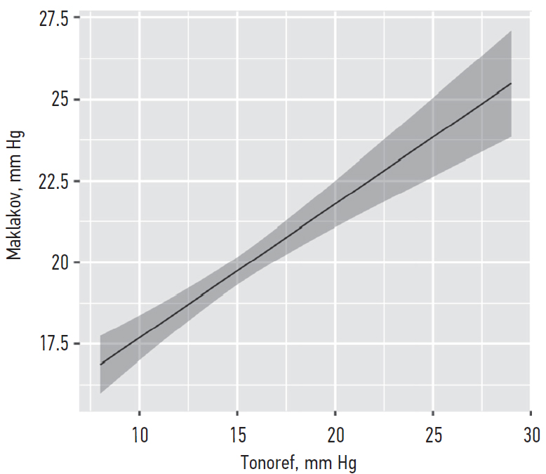 RESULTS: The mean difference in intraocular pressure level in the 1st group was –4.81 (p < 0.001), and in the 2nd –0.98 mmHg (p = 0.399). Both methods — pneumo- and rebound tonometry showed underestimated results with intraocular pressure less than 23.0 and 22.5 mmHg (respectively) relative to applanation tonometry and, conversely, overestimated intraocular pressure when these values were exceeded. A significant (p < 0.001) strong (R2 = 0.86) relationship between applanation and rebound tonometry was obtained, which made it possible, using regression analysis, to develop a formula for recalculating results of iCare tonometry into those of Maklakov tonometry: PMaklakov = 0.40 × PiCare + 13.44.