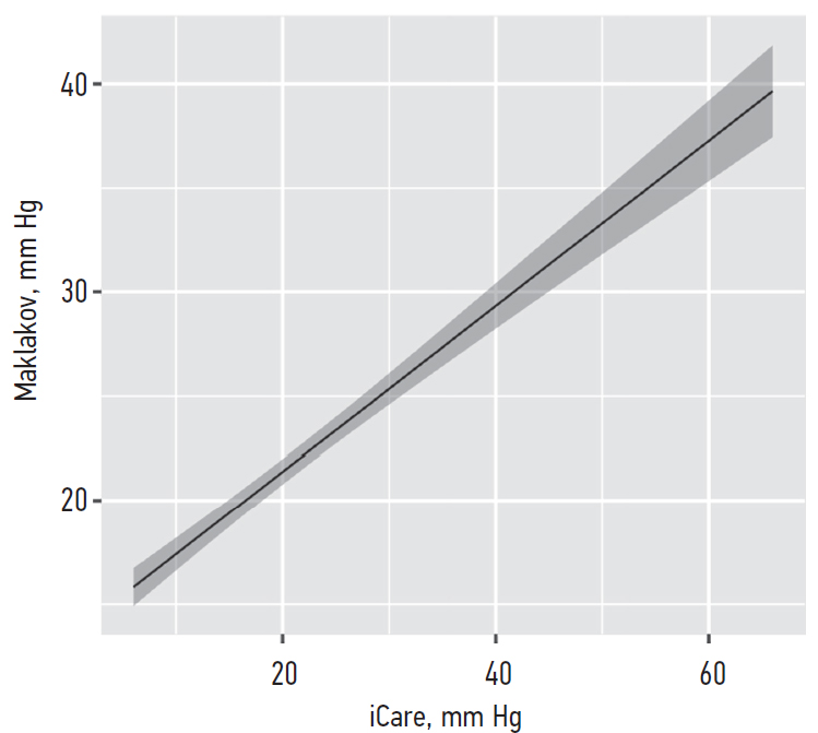 The linear regression analysis revealed the presence of significant (p < 0.001) strong (R2 = 0.86) relationship between applanation tonometry (Maklakov) and rebound (iCare) tonometry (Fig. 2).