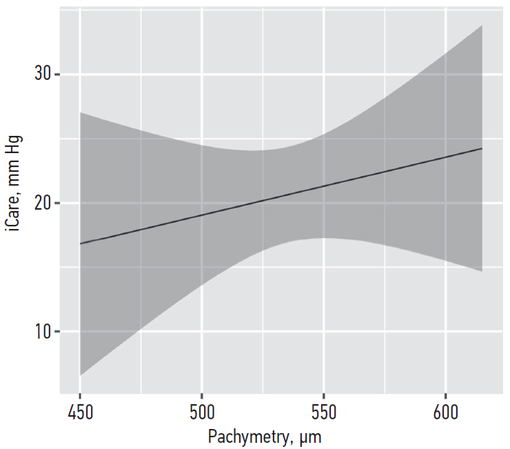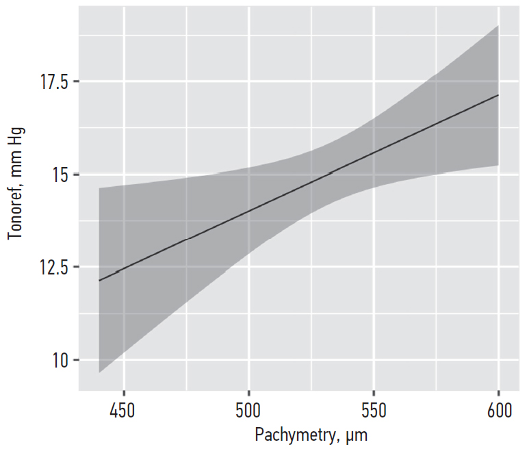 The estimation of the influence of the central corneal thickness on tonometric parameters (Tonoref and iCare) revealed a weak positive relationship, manifesting by an IOP increase at pachymetry increase. However, this relationship was extremely weak and not significant in the second group. Multiple publications on this subject are evidence of similar pattern of IOP rise during pneumotonometry [14], as well as during rebound (iCare) tonometry [15].