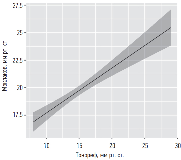 При анализе линейной регрессии установлено наличие значимой (p < 0,001) слабой (R2 = 0,37) связи между аппланационной (Маклаков) и пневмотонометрией (рис. 1).