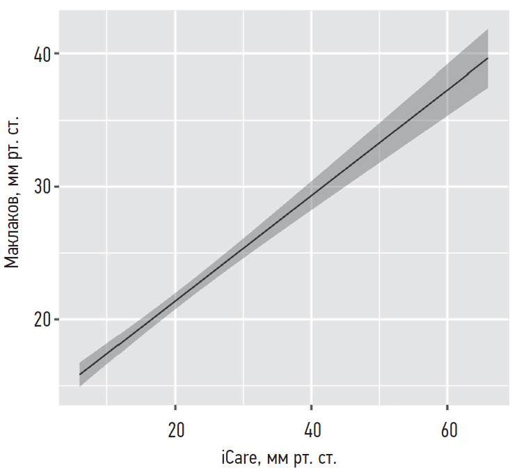 Анализ линейной регрессии выявил наличие значимой (p < 0,001) сильной (R2 = 0,86) связи между аппланационной (Маклаков) и рикошетной (iCare) тонометрией (рис. 2).