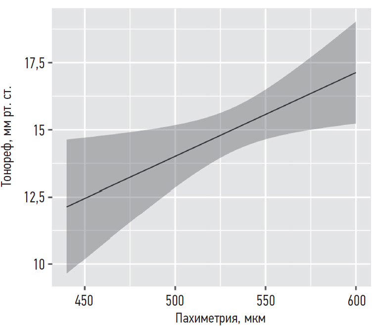 Рис. 3. Зависимость пневмотонометрии от центральной толщины роговицы (R2 = 0,07; p = 0,017)