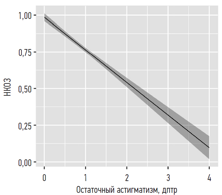 Рис. 1. Зависимость некорригированной остроты зрения (НКОЗ) от остаточного астигматизма (R2 = 0,46, p < 0,001)